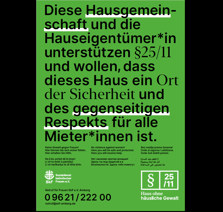 Aus diesem Grund schließt sich der Notruf für Frauen des SkF Amberg gemeinsam mit dem Wohnungsbau und Siedlungswerk Werkvolk eG der bundesweiten Initiative „§25/11-Haus ohne häusliche Gewalt“ an. Diese Initiative wurde ursprünglich vom SkF e.V. Berlin ins Leben gerufen.