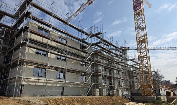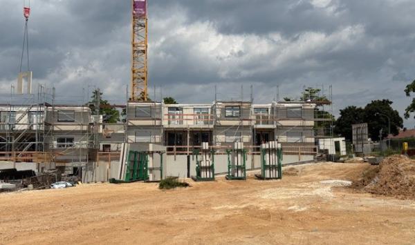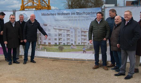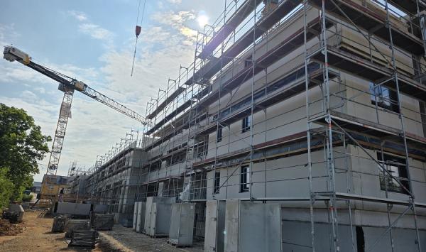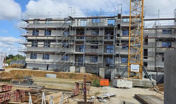 Es entstehen 56 Wohnungen in zwei modernen Gebäuden, darunter 40 barrierefreie Wohnungen; gefördert durch das Staatsministerium für Wohnen, Bau und Verkehr.